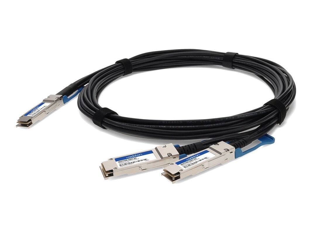 This is a Mellanox compatible 100GBase-CU QSFP28 to 2xQSFP28 direct attach cable that operates over passive copper. It has been programmed, uniquely serialized, and data-traffic and application tested to ensure it is 100% compliant and functional. This direct attach cable is TAA (Trade Agreements Act) compliant, and is built to comply with MSA (Multi-Source Agreement) standards.