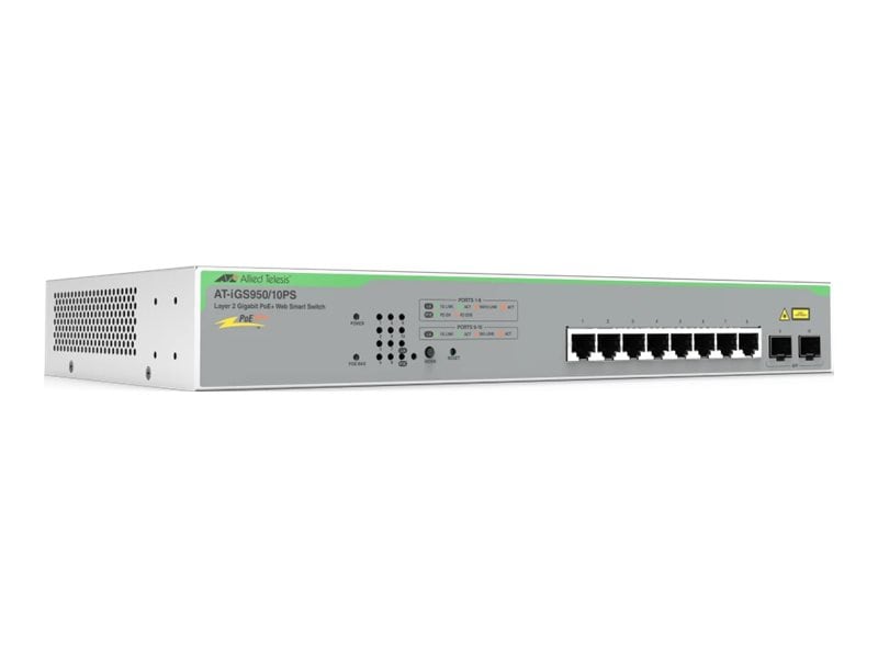 The Allied Telesis AT iGS950/10PS is a capable switch designed to meet diverse networking needs, offering robust features for efficient performance. With a total of 10 ports, including 8 PoE+ capable 10/100/1000 Base-T connections and 2 100/1000 SFP uplinks, this switch caters to various connectivity requirements. Its VLAN support allows for up to 4094 VLAN IDs, enhancing security and managing traffic more efficiently for different network segments.