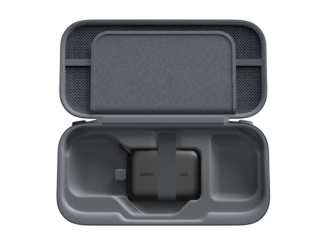 The Belkin Gaming Charging Case offers a versatile solution for gamers on the go. This case features a durable zipper closure and a handle wrap for easy carrying. With multiple compartments, including dedicated spaces for a power bank, game cards, and an AirTag pocket, organization is effortless. A kickstand groove provides added convenience for tabletop play. Additionally, the case boasts protection against water, scratches, abrasions, bumps, and drops, ensuring that gaming gear stays safe during travel.