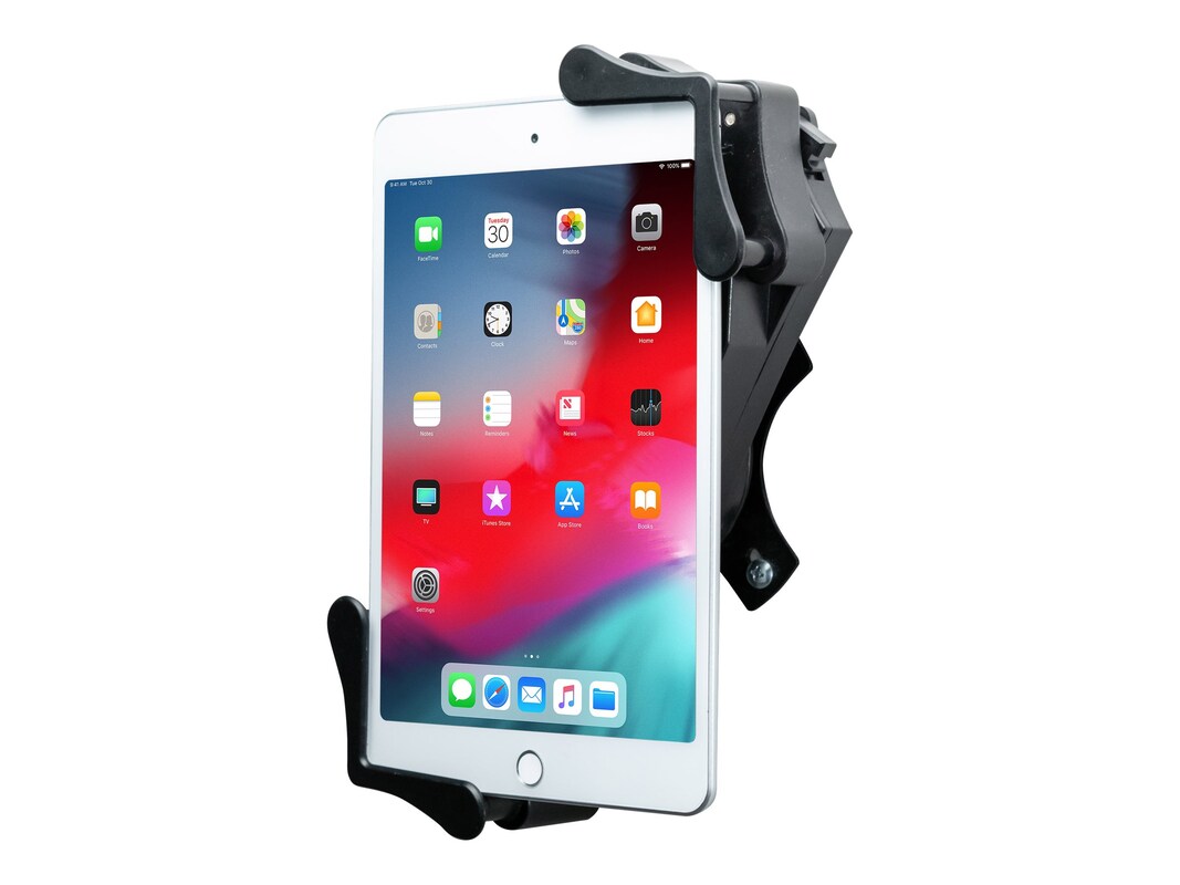 The ultimate space-saving tablet solution, this ingenious wall mount occupies minimal wall space, making it a perfect fit for hospitals, classrooms, commercial kitchens, and more. The mount only barely extends from the wall but affords a full 360-degree rotation. The unique slide-adjustable holder grips your tablet by the corners, allowing full access to all ports, buttons, and headphone jacks for compatibility with credit card readers. The mount base is VESA compatible, for easy interfacing with other VESA compliant equipment like arms.