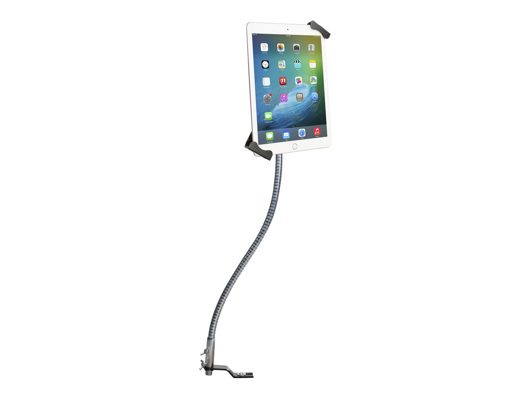This flexible tablet mount allows you to safely display your tablet at any angle in the front seat of your car. Designed for use with commercial and passenger vehicles alike, this drill-free car mount installs easily to your vehicle's seat rail using included mounting hardware and can be safely removed at any time. The flexible gooseneck can be repositioned to support your tablet at any angle while still providing enough rigidity to withstand stops, starts, and turns. The slide-adjustable tablet holder also tilts and rotates 360 degrees for portrait and landscape orientations, protecting your tablet from theft with a powerful lock and key security system. Its unique corner-grip design prevents tablet removal when locked and allows full access to your tablet's ports, buttons, cameras, and headphone jack, for card reader compatibility.