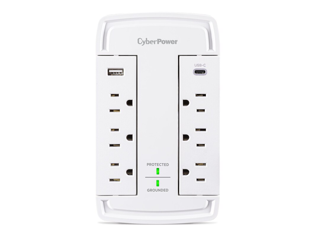 The CyberPower CSP6WSUC Wall-Tap Surge Protector with USB charging is designed to protect essential home and office electronics, including computers, networking equipment and other devices from power surges and energy spikes caused by storms and electrical fluctuations. Offering 2,400 joules of surge protection, this unit features six surge-protected AC outlets, a USB-A port with 2.4A power output, and a USB-C port delivering 15W of power, ensuring efficient charging for mobile and USB-enabled devices.