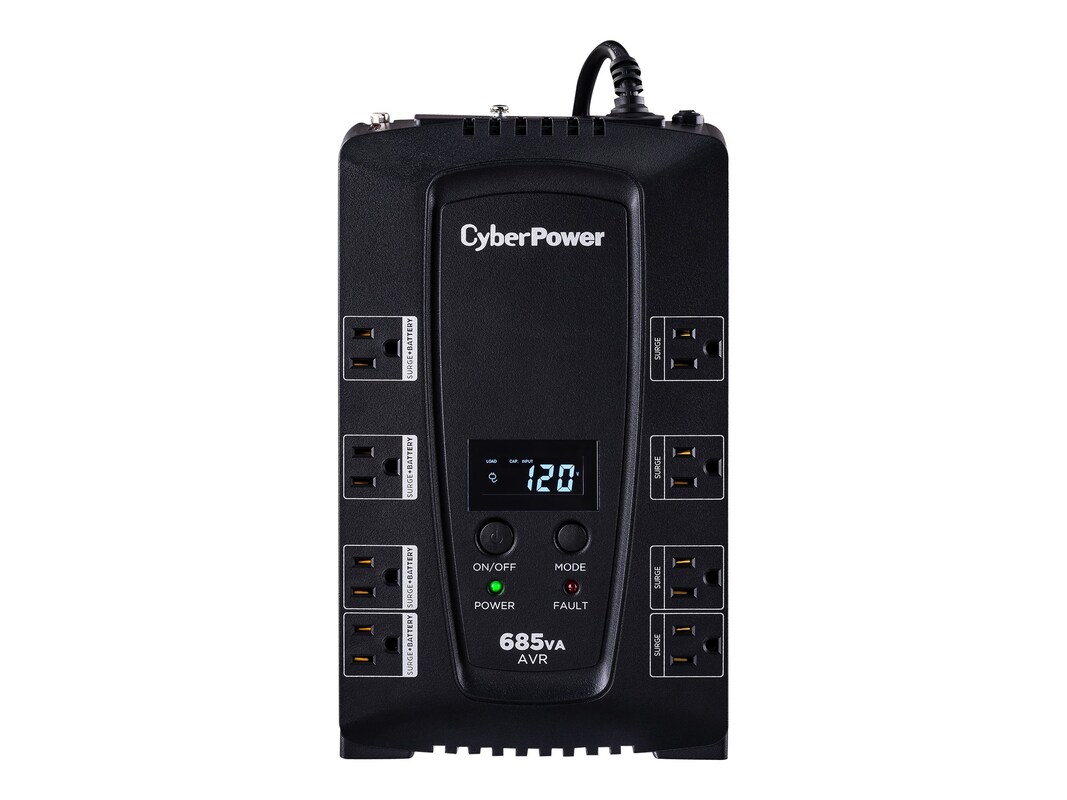 The CyberPower Systems CP685AVRLCD UPS, designed for mid to high-end computer systems, features dynamic line conditioning and a LCD diagnostic display. Real-time system vitals can be viewed from this display and the unit can be conveniently mounted in a workstation cabinet or directly on the desktop. The CP685AVRLCD guards against surges/spikes, and also offers battery backup in the event of brownouts or total power loss. Automatic Voltage Regulation (AVR) ensures that all your electronics are receiving clean power and stabilizes the voltage to a nominal 120VAC.