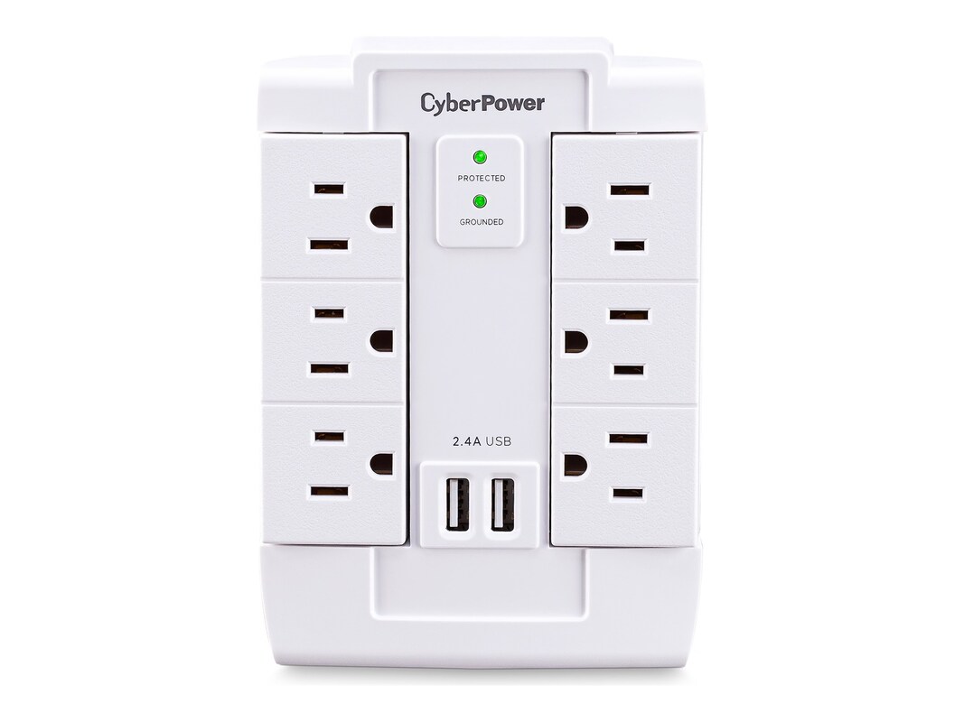 The CyberPower Professional Surge Protector is ideal for Home/Office protection with 1200 joules, 6 swivel outlets, 2 USB charge ports (2.4 Amps shared), and a convenient wall tap design. The surge protector is ideal for protecting personal computers, phones/fax/modems, printers, stereos, and other electronics. Its two USB ports are perfect for keeping tablets, smart phones, and other rechargeable electronics ready to use.
