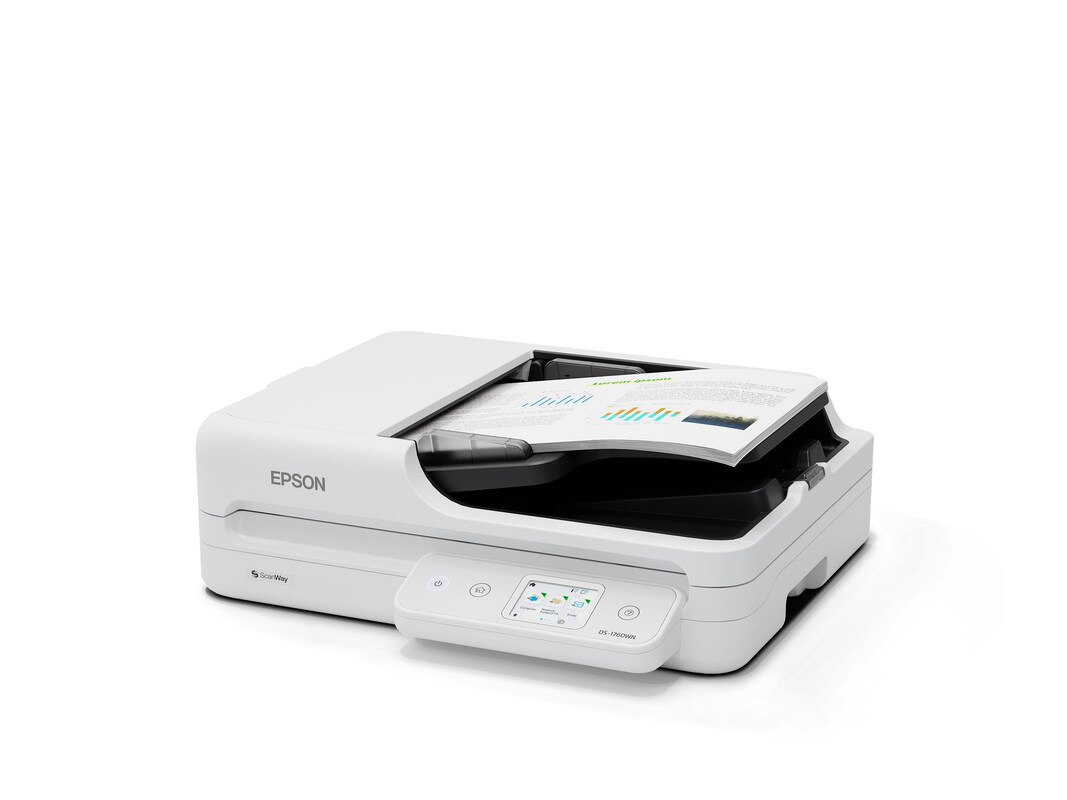 The Epson DS-1760WN document scanner is designed for efficient and versatile scanning needs. With a compact desktop form factor, this scanner supports a wide range of document types, including plain paper and bulk objects such as books. Equipped with a robust automatic document feeder that can hold up to 60 sheets, it ensures continuous scanning without interruptions. The device features an intuitive 2.4" touch screen display for easy navigation, allowing users to perform functions such as scanning to USB, email, or network folders effortlessly. With a maximum optical resolution of 600 DPI, both in horizontal and vertical directions, the scanner captures fine details and produces images. It also offers scanning speeds of up to 30 pages per minute in both black and color. Advanced features such as automatic duplexing, blank page skipping, and image correction enhance usability and efficiency, making the Epson DS-1760WN an ideal choice for busy office environments looking to streamline document management.