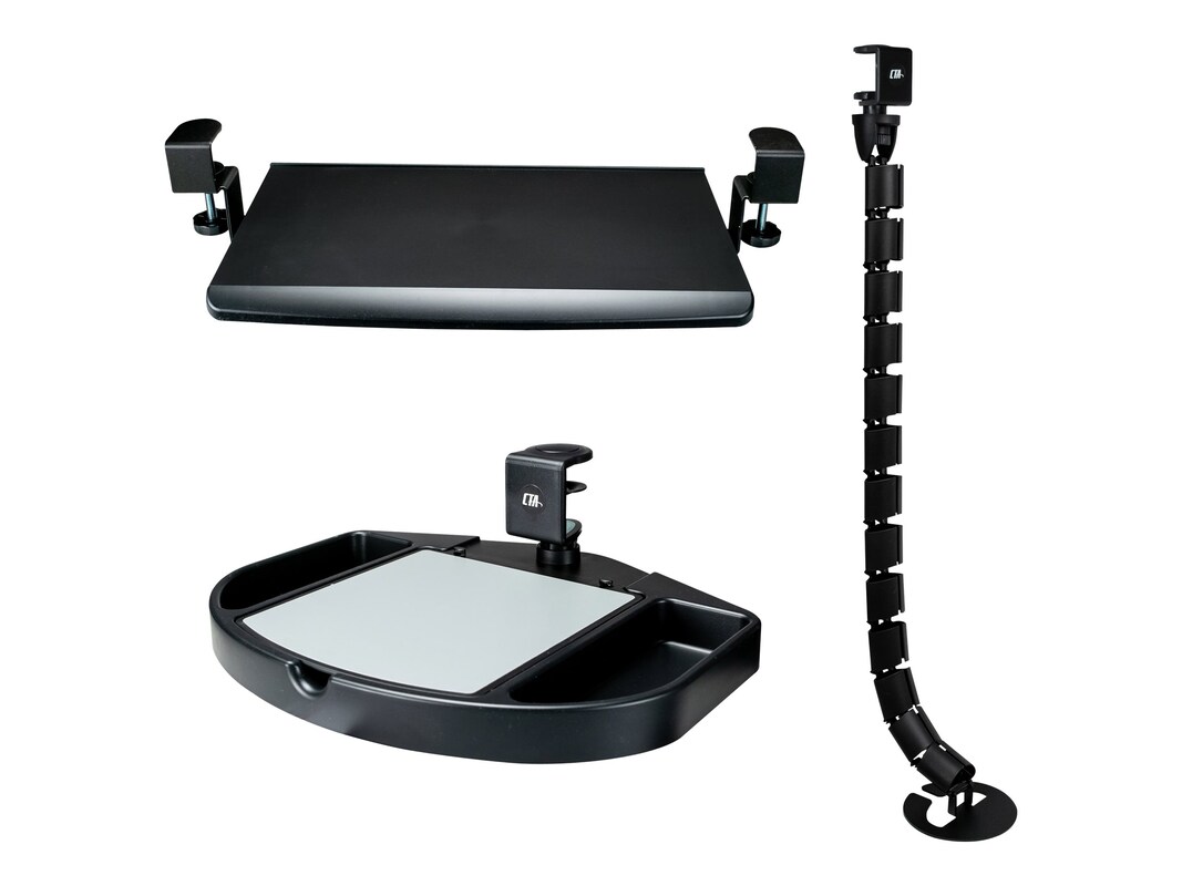 This workspace bundle enhances your desk with three essential add-ons. The large keyboard tray expands your usable surface area, providing 1.67 square feet of space for your keyboard, laptop, mouse, coffee, and more. The organizer tray features 4 separate compartments to keep your office supplies neatly stowed away and on hand. This organizer tray also includes an attachable cover, converting the entire add-on into a satellite mouse-pad. Finally, the flexible cable routing column provides clean threading space for power cables for all of your devices, keeping them organized, untangled, and out of sight. All three add-ons clamp on to your desk without drilling so that you can always rearrange.