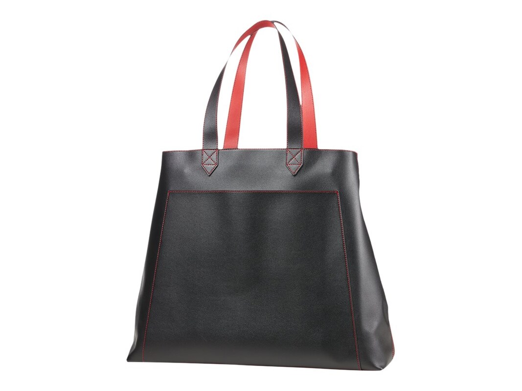 The Rouge Noir Vegan Leather Tote with inset top zipper closure is Francine's distinctive carryall bag. You've seen it before, but it's much better from Francine. The sculpted tapered silhouette features elegant scarlet red contrast stitching and loads of room. Its large exterior computer file pocket is easy to reach for quick access. The interior zippered accessory pocket fits phone and important personal items. A wardrobe must-have!