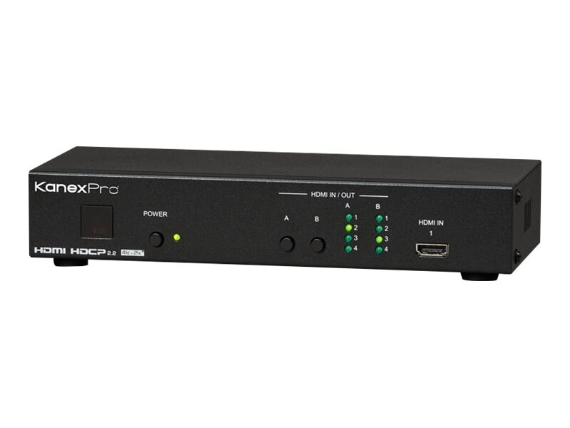 The KanexPro HDMX42-18G is an easy to use, cost-effective 4K/60Hz with 4:4:4, 16-bit Deep Color, HDR (High Dynamic Range) and HD audio formats based on HDMI 2.0 specs. Designed with 4 inputs and 2 outputs for swift switching and routing of any HDMI sources such as laptops, Blu-ray players, and 4K based Apple TV to any four displays. This matrix switcher is HDCP 2.2 compliant and supports 4K@60Hz, 4:2:0 video. It can be controlled via front panel buttons, IR remote and RS232 commands.