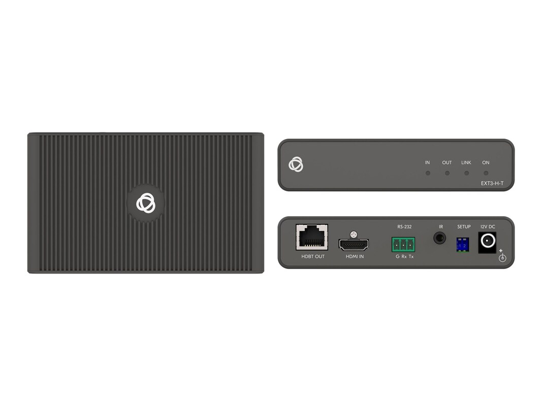 The Kramer EXT3-H-T is a versatile video/audio/infrared/serial extender, designed to cater to modern connectivity needs. It operates in a range of environments, with a temperature between 0°C and 40°C and a humidity range of 10 to 90% RH (non-condensing). This device features multiple interfaces, including RS-232, HDMI, HDBaseT, and IR, ensuring compatibility with various systems. The design includes a fanless structure and a height of 1 rack unit, making it suitable for both desktop use and rack mounting.
