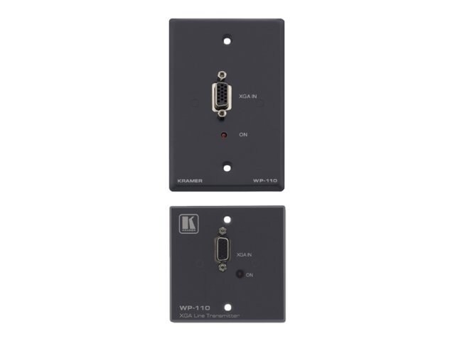The WP-110 is a wall plate twisted pair transmitter for computer graphics video signals with resolutions up to and exceeding UXGA. It converts a computer graphics video signal into a twisted pair signal that the TP-120 twisted pair receiver (or other compatible Kramer receiver) converts back into a computer graphic signal.