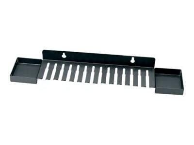 The unique dual-size "claw" configuration of this versatile wall mount cable hanger provides efficient storage for all cables large and small. This cable manager is available with side trays for holding small items, or without side trays for increased storage density. Black powder coat finish. Convenient wall storage of connection cables. Sturdy steel construction.
