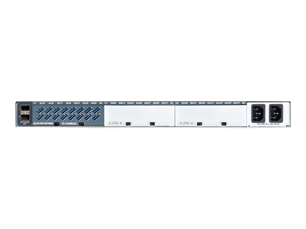 Integrated dual 1 Gb Ethernet or dual 1 Gb SFP interfaces. HTML5 support for Java-free web based telnet/SSH remote access to console ports that is browser independent. Provides multiple layers of out-of-band access with optional dial-up and cellular technologies. Reduces operating costs and security risks by eliminating the need for on-site interventions. Simplifies service deployments and balances CAPEX and OPEX with its modular design. Minimizes cable clutter with software-reversible device port pins. Increases testing productivity and efficiency as a DUT (device under test) aggregation tool. Protects management interfaces with authentication and FIPS 140-2 compliant encryption. Built-in support for environmental sensors and dry contact access control devices.