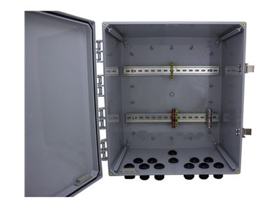 Transition Networks' Outdoor Cabinet Assembly is an impact-resistant polycarbonate enclosure with a hinged cover that permits a 225° door swing and allows for easy door removal during installation or maintenance. The door is secured by two stainless steel latches that are bolted in place (providing more security than pop rivets or slide-on latches) and can be further secured with pad locks (not included). The 18" x 16" x 10" cabinet is deep enough to protect the bend radius of fiber cables connected to nearly any Transition Networks temperature hardened switch when mounted in the enclosure. A liquid tight vent plug is included to prevent condensation inside the enclosure.