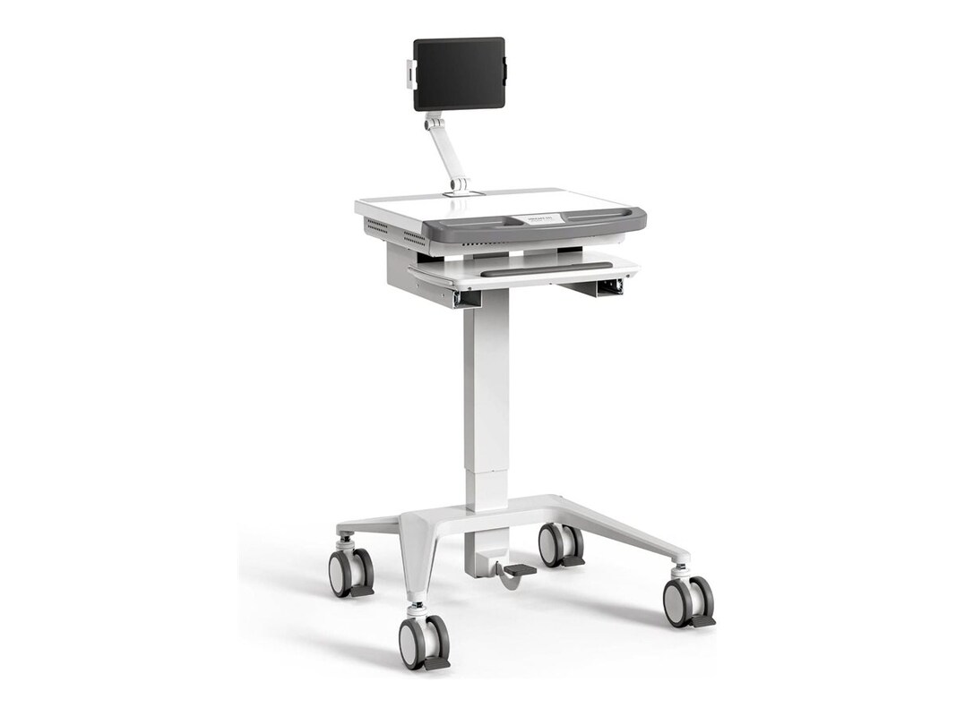 The Mount-It! MedHub MI-16018 is a mobile workstation designed for tablet use, accommodating devices ranging from 4.7 to 12.9 inches. Built with practicality in mind, this cart features 4 wheels for smooth mobility, complemented by 4 brakes that ensure stability when needed. It provides a range of adjustments, allowing for height variations, as well as tilt, pan, and rotation actions for customizable positioning. The integrated tablet arm, sliding keyboard tray, and sliding mouse pad help enhance workflow efficiency, making it an ideal solution for medical environments or spaces requiring a flexible workstation.