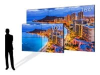 The Planar VM Complete VMC55MXM9 video wall features nine 55-inch LCD video wall displays in a 3x3 landscape configuration, with tiled bezel widths of 0.88 millimeters. With a diagonal video wall size of 164 inches, and 700-nit brightness, it is ideal for any retail store, hospitality setting, or corporate lobby.