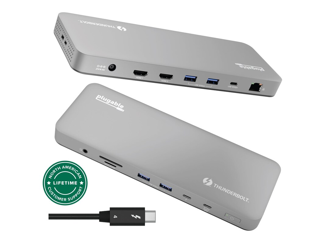 Expand a single Thunderbolt port into 13 essential connections with this Plugable docking station, including dual HDMI 2.0 ports for up to two 4K 60Hz displays on M4, M3 (in clamshell mode), and Pro/Max M-Series Macs, 100 charging (96W certified) for your laptop, a 40Gbps downstream Thunderbolt port also capable of 15W charging and up to 8K video, plus SD/microSD UHS-II card readers, USB-C and USB-A ports, Ethernet, and audio. It’s plug-and-play ready - no drivers required.