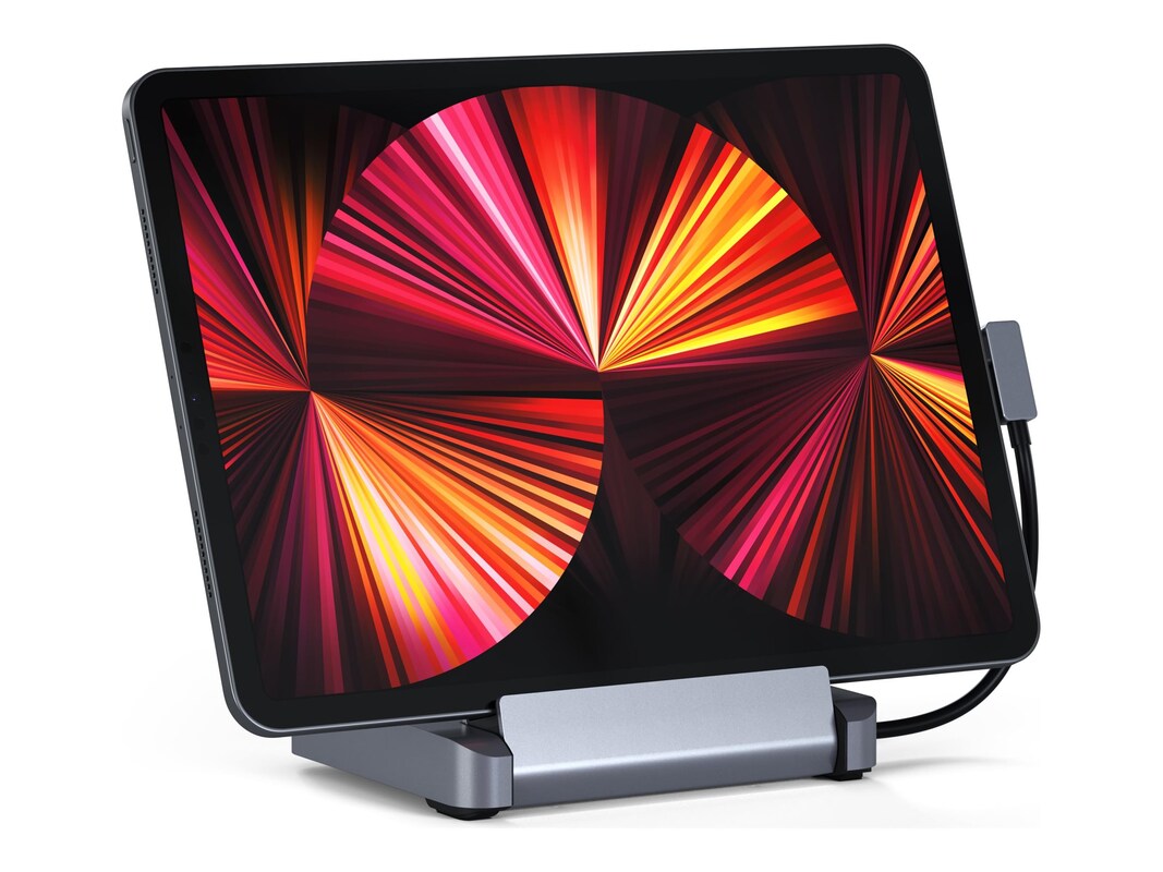 Enhance your iPad Pro experience with the Satechi Aluminum Stand & Hub, a versatile 6-in-1 docking station designed to maximize functionality and portability. Specifically crafted for Apple iPad Pro (2018 & newer), this hub features essential ports including USB-C PD charging (up to 60W), USB-A data, 4K HDMI (up to 60Hz), and micro/SD card readers, seamlessly transforming your iPad Pro into a full-fledged workstation wherever you go, eliminating the need for a traditional desktop setup. The stand's adjustable hinges provide the perfect viewing angle for Zoom calls or creative tasks, while its modern aluminum finish adds a sleek touch to your workspace. Enjoy high-resolution display capabilities and easy connectivity for peripherals, all in a compact, foldable design that protects your iPad Pro with padded support. Elevate your productivity with the Satechi Aluminum Stand & Hub, ideal for M2, M1 iPad Pro/iPad Air, and iPad Mini 6 Gen, ensuring seamless integration and efficiency wherever your work takes you.