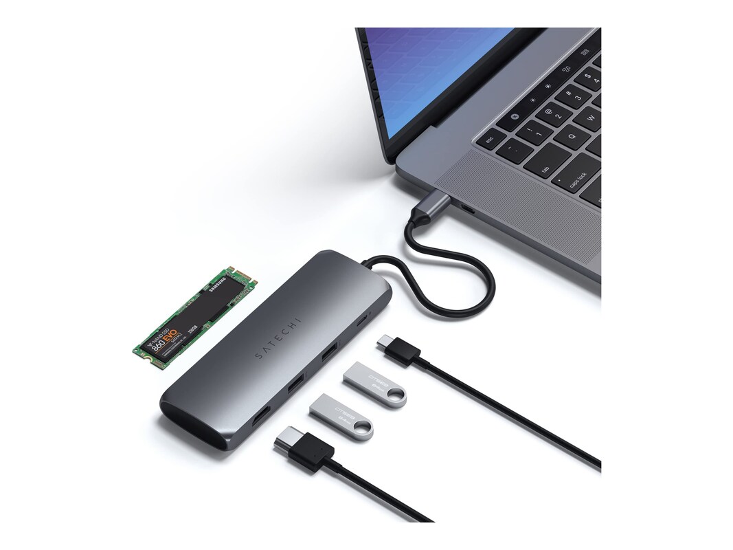 Level up your data storage at home or on-the-go using the Satechi USB-C Hybrid Multiport Adapter. The USB-C Hybrid Multiport Adapter features a built-in SSD storage compartment, 4K HDMI display output, USB-C PD charging, and 2 USB-A 3.1 data. Built-in SSD Storage Features a built-in SSD storage compartment with fast data transfer rates, up to 5 Gbps, to easily increase memory storage and hold important file backups all in one place. When installing a brand new M.2 SATA SSD into the hub, please make sure to format the drive to the appropriate operating system it will be used with. If the SSD is not formatted correctly, the drive will not appear as a mounted storage device. Fits SATA M.2 SSD (not included). Brilliant 4K HDMI Enjoy stunning 4K HDMI output on supported external monitors or displays with refresh rates up to 60Hz for smoother streaming and an optimal view. Requires a direct HDMI connection. Power Delivery Equipped with an USB-C PD charging port to keep your setup powered throughout the day ? up to 100W. Note: 15W of pass-through power is used for the hub?s operation. More Ports, more data Includes 2 USB-A 3.1 data ports for additional data transfer options for your USB devices peripherals ? up to 10 Gbps. Compatible with 2021 MacBook Pro 14-inch, 16-inch (M1 Pro & Max), 2020 MacBook Pro/ Air M1, 2019/2018/2017/2016 MacBook Pro, 2018 MacBook Air, 2021 iPad Pro, 2020/2018 iPad Pro, 2020 iMac M1, 2019/2017 iMac, iMac Pro, 2017/2016/2015 MacBook, Microsoft Surface Laptop 3/Surface Pro 8/Go, USB-C Thunderbolt 3-4, USB4 devices. Important Does not support charging or card readers, including Apple SuperDrive. The MagSafe 3 port on the MacBook Pro (16 inch, M1 Pro/Max, 2021) will charge up to 140W while the USB-C port will support 100W max. For faster charging, use MagSafe 3 port directly on computer. 2 Years Manufacturer Warranty.