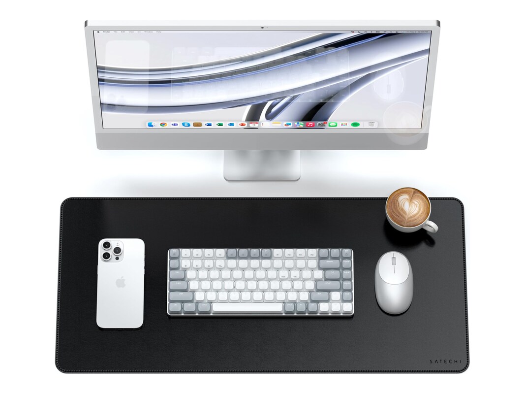 Enhance your workspace with the Satechi Premium Vegan-Leather Desk Mat. Perfectly crafted to complement any office or home decor, this mat comes in three elegant colors. With its durable, reinforced stitching and water-resistant finish, it not only adds a touch of style but also protects your desk. Measuring 68x31.5x3.3 cm, it provides ample room for your computer, accessories, or arts projects. Its anti-slip design ensures it stays in place on any surface, making it a versatile and essential addition to your desk accessories.