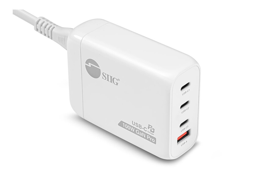 The SIIG 3C1A power adapter provides versatile charging solutions for a variety of devices including tablets, cellular phones, and notebooks. With a compact size and durable plastic material, this portable charging station incorporates GaN Pro technology, ensuring efficient power distribution while maintaining a lightweight design. Equipped with multiple output options, including four connectors for USB-C and USB Type-A, it delivers up to 100 W of power to keep devices charged without hassle.