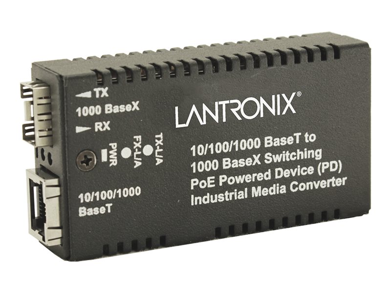 This hardened Gigabit Mini PD Media Converter is a PoE powered device which provides a cost-effective method for integrating fiber optic cabling into hardened or outdoor 10/100/1000 UTP environments. The device is powered through the RJ-45 copper port when connected to power sourcing equipment, meaning no separate power connection is required. With its miniature size, the Mini offers a space saving alternative while it converts copper to fiber within a very small footprint.