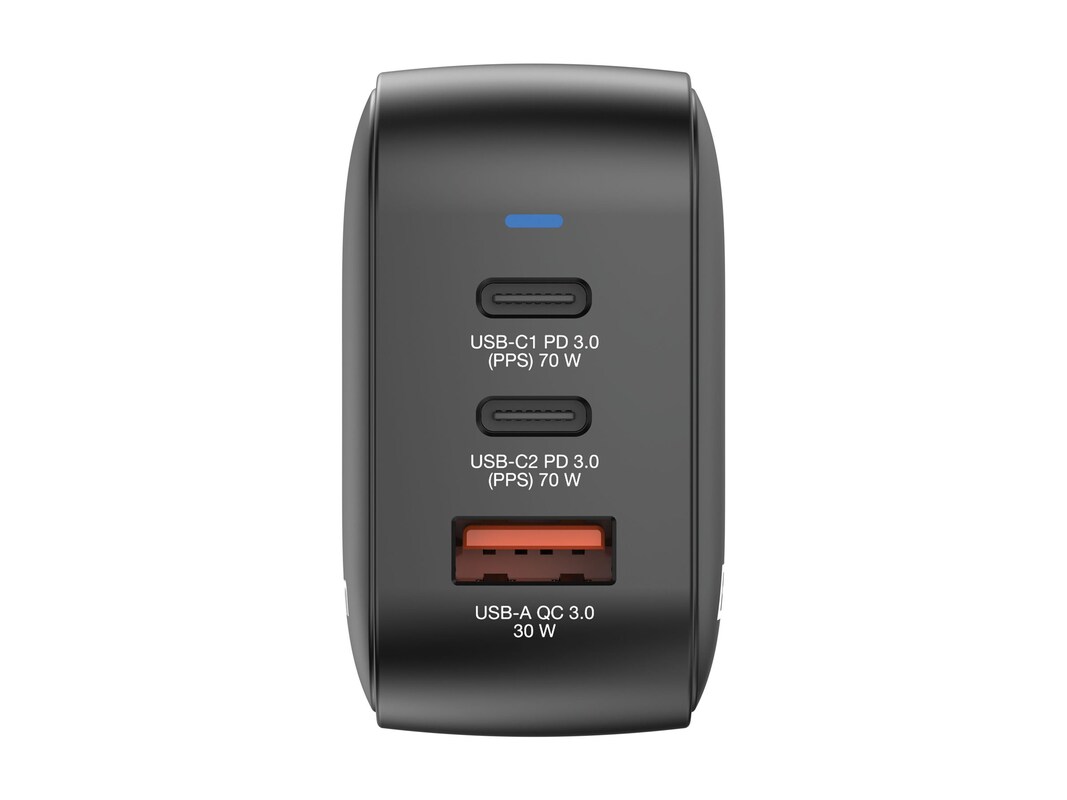 Verbatim's 70W Mini GaN Charger combines two USB-C and one USB-A port into a compact, pocket-sized design. Capable of charging up to 3 devices simultaneously, the USB-C ports support PD 3.0 (Power Delivery) at 70W while the USB-A port supports QC 3.0. This mini GaN charger features an advanced chipset that allows for an even more compact design than regular GaN chargers without sacrificing power. This innovative technology not only reduces the charger's size but also minimizes heat generation, delivering safer and more efficient charging in a portable form factor. This charger supports USB Power Delivery 3.0, PPS, and Quick Charge 3.0, 4, and 4+ standards. The compact design of this charger includes foldable US prongs, and replaceable EU and UK plugs, making it ideal for the office, home or travelling to power your laptop, tablet, smartphone, gaming devices, and more. Built from flame-resistant polycarbonate, the Verbatim 70W Mini GaN Charger comes in eco-friendly packaging with a 1-year warranty.